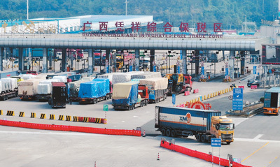 隨著中越經(jīng)貿(mào)合作日益緊密,中越雙邊貿(mào)易呈現(xiàn)出良好發(fā)展態(tài)勢,主要邊境口岸一派繁忙景象。圖為廣西壯族自治區(qū)憑祥綜合保稅區(qū)。新華社記者 周 華攝