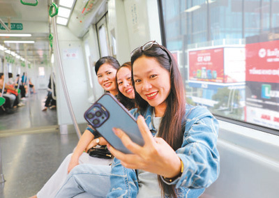越南當(dāng)?shù)孛癖娫诤觾?nèi)吉靈—河?xùn)|線輕軌車廂里自拍。人民日報海外版記者 沈小曉攝
