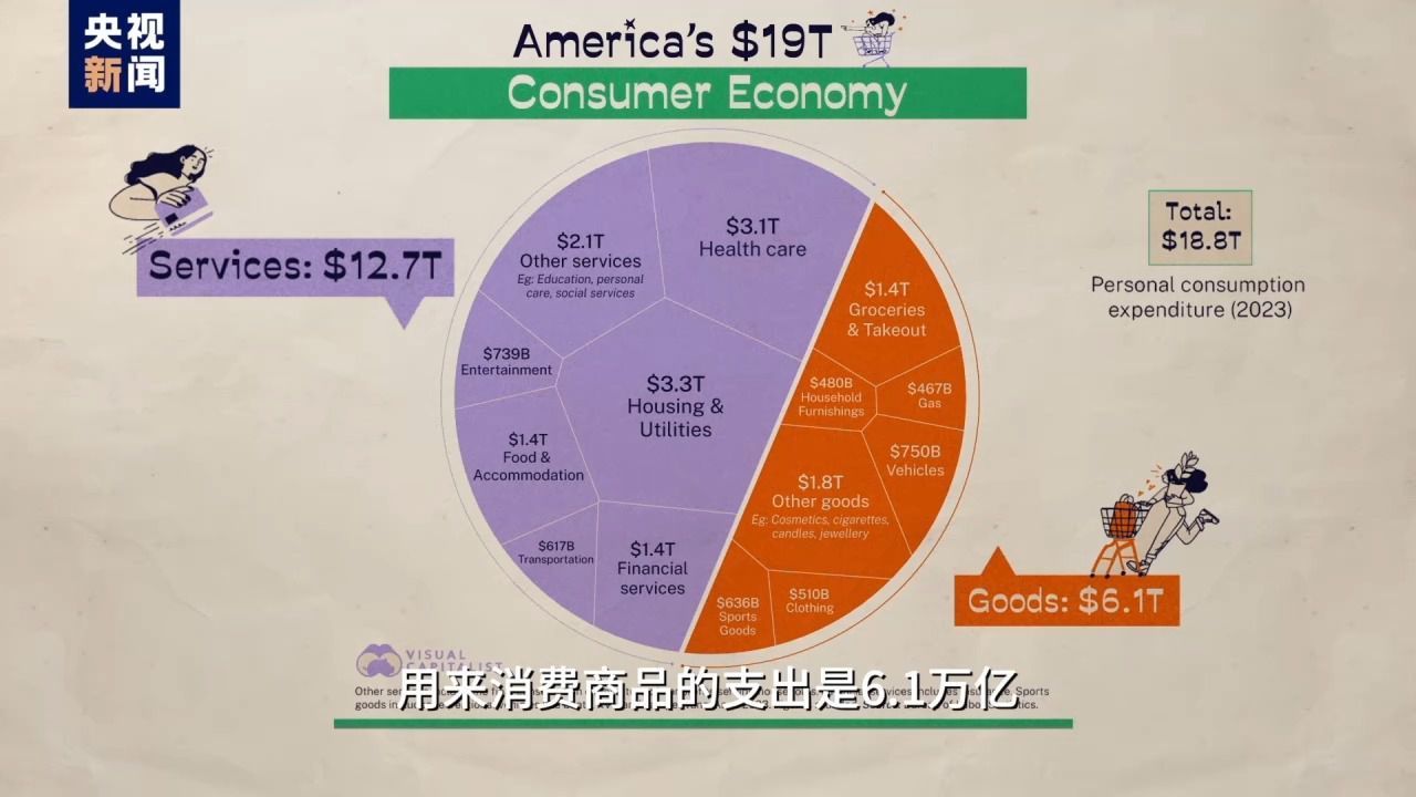 按美國(guó)勞動(dòng)局?jǐn)?shù)據(jù),美國(guó)人2023年消費(fèi)支出18.8萬(wàn)億美元,其中12.7萬(wàn)億花在了看病、租房、交學(xué)費(fèi)、打官司等服務(wù)上,用來(lái)消費(fèi)商品的支出是6.1萬(wàn)億,不到總消費(fèi)的三分之一。所以吹噓美國(guó)消費(fèi)能力強(qiáng)屬實(shí)是個(gè)“地獄笑話”,看病花錢(qián)多有什么可驕傲的?