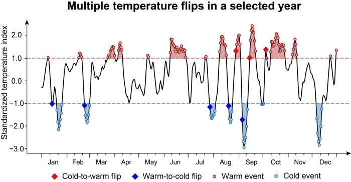 氣溫驟變是指氣溫在短時(shí)間內(nèi)從異常炎熱驟降至異常寒冷,或反向急升的突然變化。由于缺乏足夠時(shí)間去適應(yīng)和應(yīng)對(duì),這類驟變可能會(huì)放大獨(dú)立的極端高溫或低溫事件對(duì)社會(huì)和自然系統(tǒng)造成的負(fù)面后果,影響人類和動(dòng)植物健康、基礎(chǔ)設(shè)施及農(nóng)業(yè)生產(chǎn)等。盡管針對(duì)獨(dú)立的冷或暖事件的研究日益增多,但人們對(duì)二者之間快速轉(zhuǎn)變及其影響所知甚少。