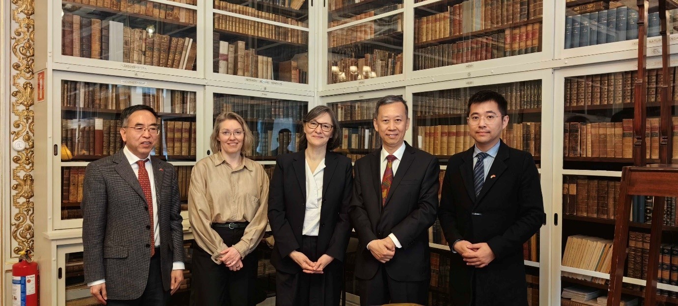 中國(guó)駐瑞典大使崔愛(ài)民(右二)會(huì)見(jiàn)瑞典皇家工程院院長(zhǎng)塞爾格(中)。中國(guó)駐瑞典大使館供圖