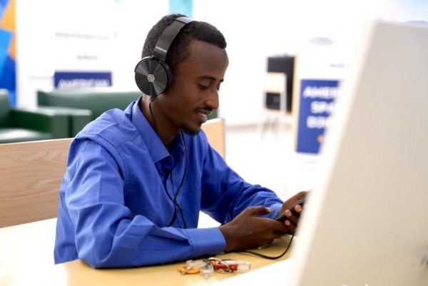 在明亮現(xiàn)代的信息技術(shù)閱覽室,當(dāng)?shù)刈x者正在沉浸式學(xué)習(xí)。人民網(wǎng) 塔里克·易卜拉欣攝
