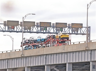 針對(duì)美國(guó)新關(guān)稅政策,加拿大對(duì)美國(guó)汽車對(duì)等征收25%關(guān)稅措施已于日前生效。圖為近日,在加拿大安大略省尼亞加拉瀑布市加美邊境地帶,一輛滿載的汽車運(yùn)輸車通過劉易斯頓—昆斯頓橋開往加拿大。鄒 崢攝(新華社發(fā))