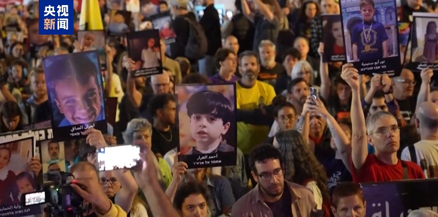 當地時間24日,數百名以色列民眾在特拉維夫舉行抗議??棺h者呼吁實現巴以和平,要求以色列政府結束當前沖突,稱緩和沖突有助于以色列被扣押人員獲釋。
