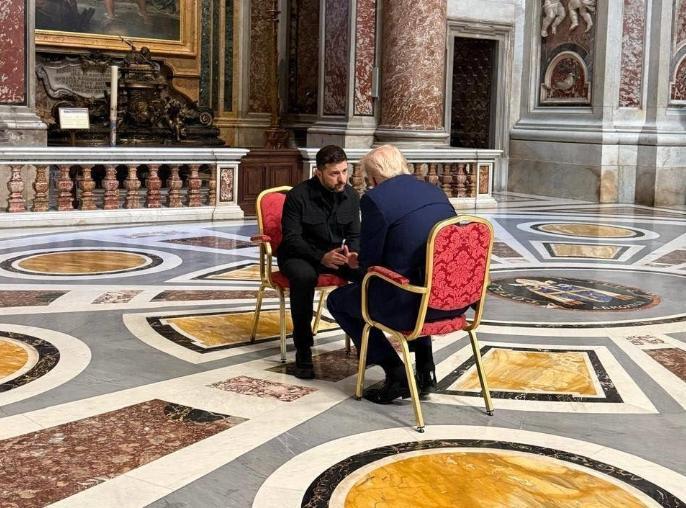 根據(jù)英國天空新聞網(wǎng)此前發(fā)布的現(xiàn)場照片,澤連斯基和特朗普坐在教堂內(nèi),進行了面對面交談。