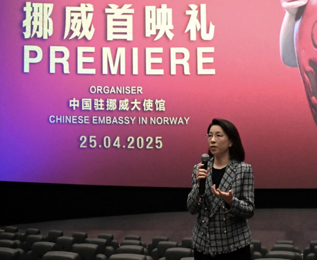 中國(guó)駐挪威大使侯?lèi)偝鱿赌倪?》首映活動(dòng)并致辭。中國(guó)駐挪威大使館供圖