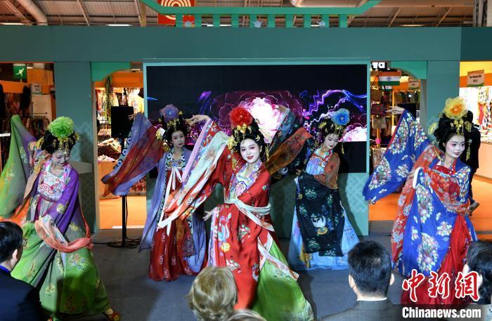 當(dāng)?shù)貢r(shí)間4月30日,“遇鑒中國(guó)”2025中華文化主題展在巴黎國(guó)際博覽會(huì)拉開(kāi)帷幕。圖為裝扮成唐代仕女的中方參展人員在中國(guó)展區(qū)表演?!≈行律缬浾?李洋 攝