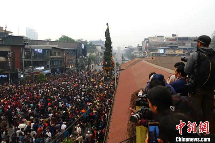 當?shù)貢r間4月5日,尼泊爾加德滿都,尼泊爾迎來一年一度的戰(zhàn)車節(jié),民眾拉著32英尺(約9.75 米)高的神像戰(zhàn)車進行巡游,吸引大批尼泊爾民眾及外國游客圍觀。中新社記者 崔楠 攝