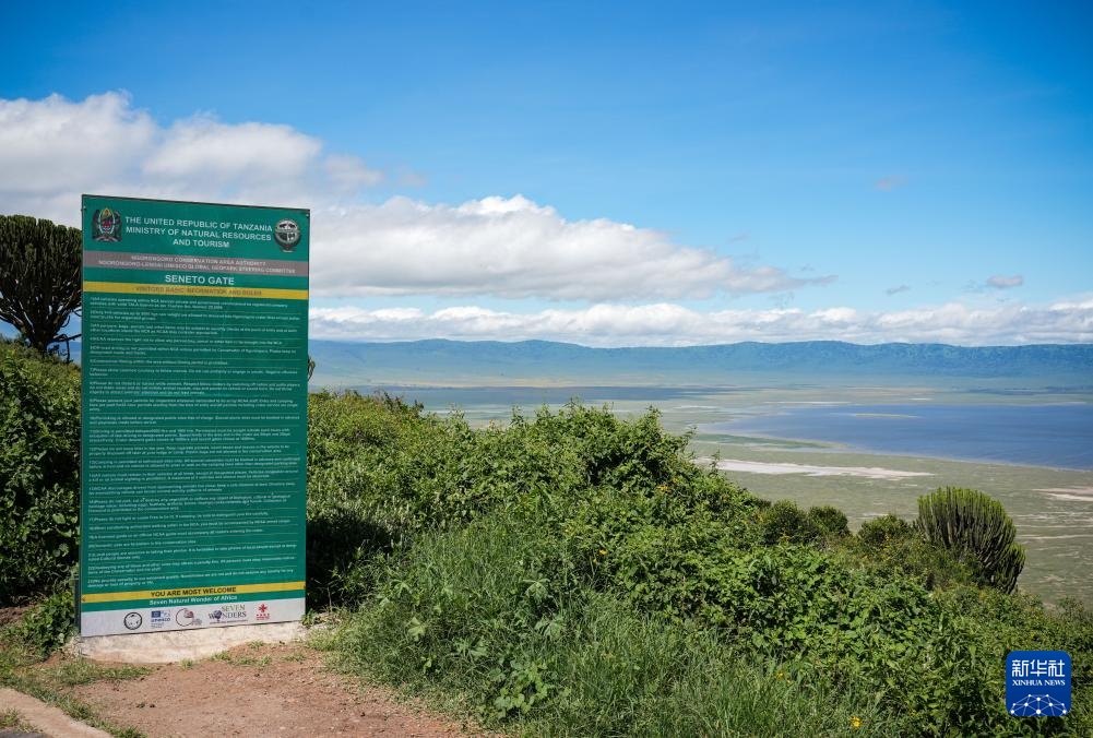 這是4月26日在坦桑尼亞阿魯沙恩戈羅恩戈羅-倫蓋地質(zhì)公園拍攝的中企修建的解說牌。新華社記者 李亞輝 攝