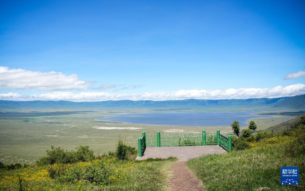 站在火山口一處新建的觀景平臺俯瞰,廣袤的谷底恰似一幅徐徐展開的自然畫卷:在雨后的藍天白云映襯下,澄澈的湖泊宛若寶石般鑲嵌在草原上;成群的角馬、斑馬與羚羊等野生動物化作一個個黑點,如同律動的音符,在天地間奏響著一曲原始而壯美的生命樂章。