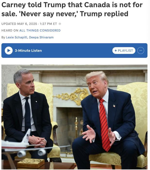 會晤時,卡尼強調(diào),加拿大永遠(yuǎn)不會出售。而特朗普則表示,“永遠(yuǎn)別說永遠(yuǎn)”,他還認(rèn)為,美加邊界是“人為劃定的”。
