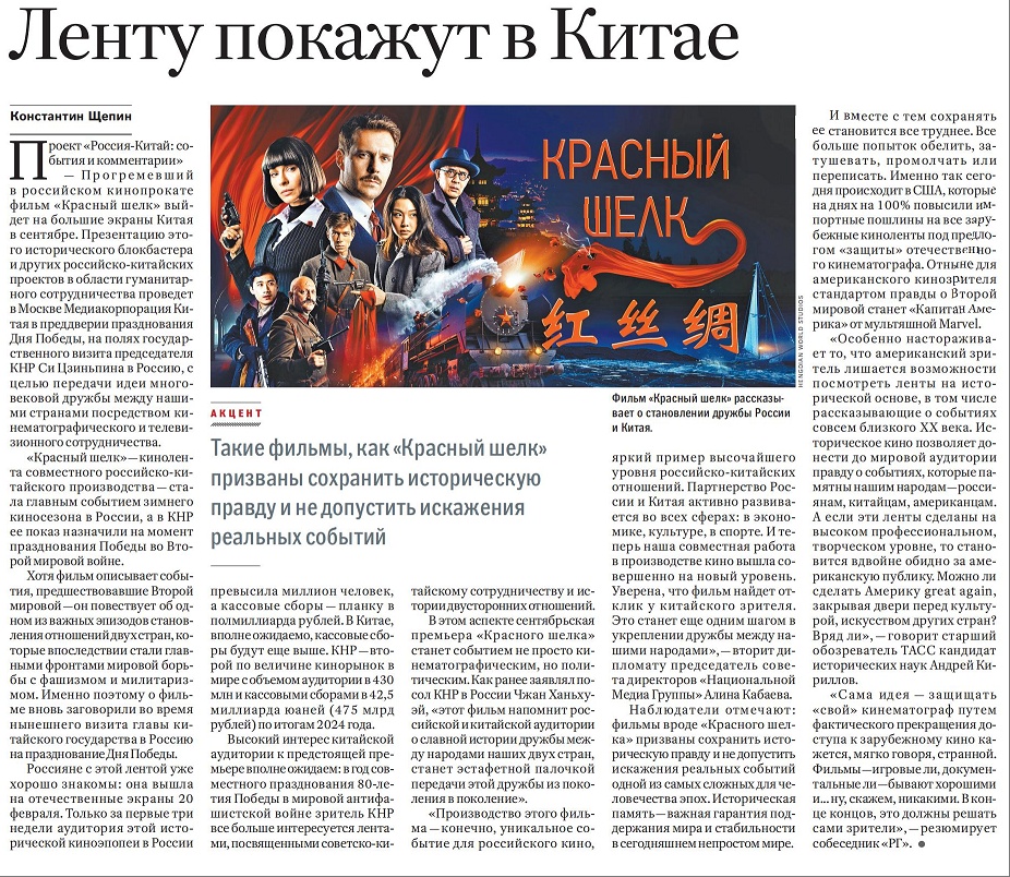 當(dāng)?shù)貢r(shí)間5月7日,俄羅斯政府機(jī)關(guān)報(bào)《俄羅斯報(bào)》刊發(fā)題為《中俄合拍電影〈紅絲綢〉將在中國上映》的評論文章。文章指出,在俄羅斯紀(jì)念蘇聯(lián)偉大衛(wèi)國戰(zhàn)爭勝利80周年前夕,在中國國家主席習(xí)近平應(yīng)邀對俄羅斯進(jìn)行國事訪問之際,中國中央廣播電視總臺將在莫斯科舉辦中俄合拍電影《紅絲綢》及其他中俄人文合作項(xiàng)目的推介活動,通過影視交流合作傳遞中俄世代友好。文章援引專家觀點(diǎn)強(qiáng)調(diào),電影《紅絲綢》肩負(fù)著守護(hù)歷史真相的使命,防止人類至暗時(shí)刻的歷史被篡改。