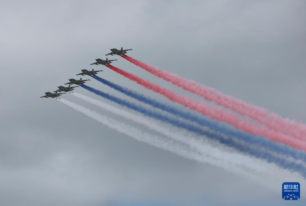 5月9日,在俄羅斯首都莫斯科,參加紀(jì)念蘇聯(lián)偉大衛(wèi)國(guó)戰(zhàn)爭(zhēng)勝利80周年閱兵式的戰(zhàn)機(jī)編隊(duì)拉煙飛行。