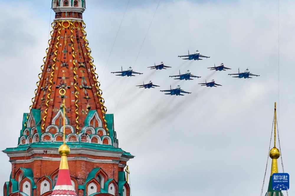 5月9日,在俄羅斯首都莫斯科,戰(zhàn)機(jī)編隊(duì)參加紀(jì)念蘇聯(lián)偉大衛(wèi)國(guó)戰(zhàn)爭(zhēng)勝利80周年閱兵式。
