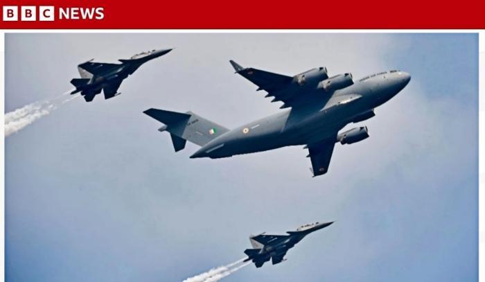 印軍戰(zhàn)斗機(jī)伴隨運(yùn)輸機(jī)飛行。圖/英國廣播公司網(wǎng)站報(bào)道