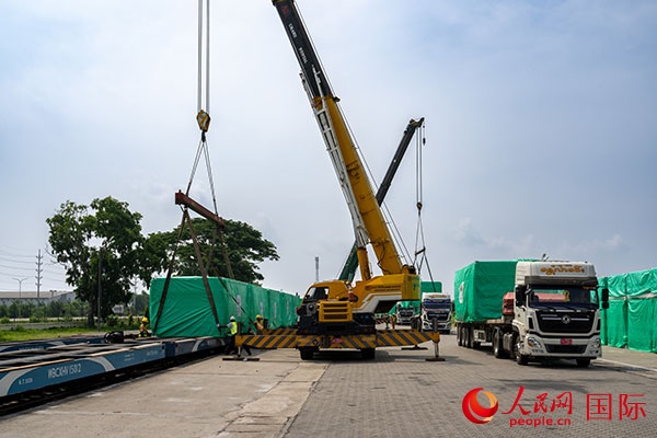 當(dāng)?shù)毓と擞没疖囇b載援緬第十三批緊急人道主義地震救災(zāi)物資運(yùn)往災(zāi)區(qū)。人民網(wǎng)記者 謝佳君攝