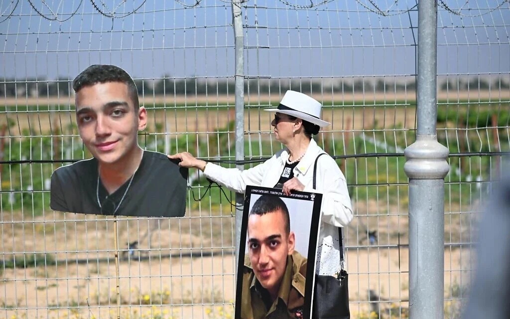△2025年4月20日,艾丹·亞歷山大的祖母在加沙地帶邊境附近手捧被扣押的艾丹的照片。(來源:《以色列時報》)