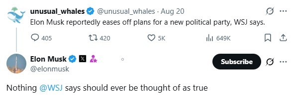 《華爾街日報》指出,馬斯克的姿態(tài)與此前相比有所轉變,當時他表示將組建所謂的美國黨,代表對兩大政黨不滿的美國選民。