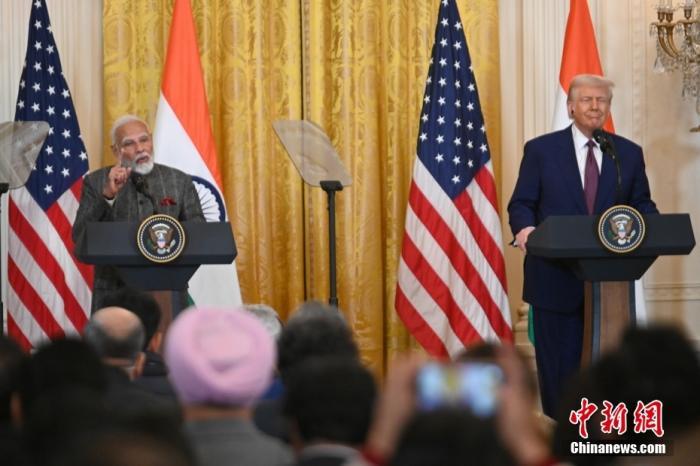 資料圖:當(dāng)?shù)貢r(shí)間2月13日,華盛頓,美國(guó)總統(tǒng)特朗普與來訪的印度總理莫迪在白宮舉行會(huì)晤。圖為雙方在會(huì)晤后出席聯(lián)合記者會(huì)。中新社記者 陳孟統(tǒng) 攝