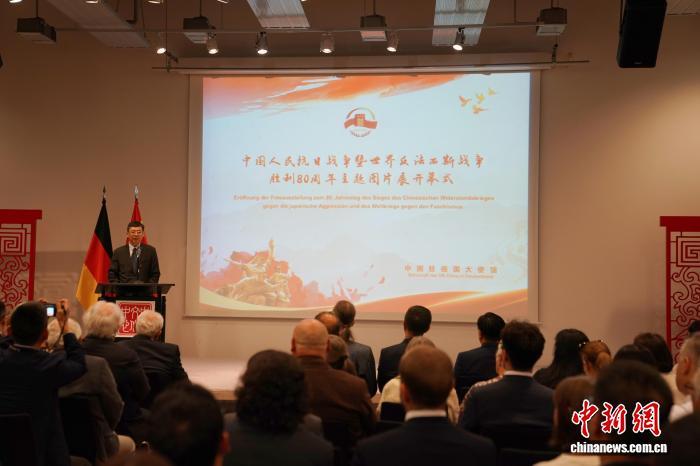當(dāng)?shù)貢r間8月26日晚,紀(jì)念中國人民抗日戰(zhàn)爭暨世界反法西斯戰(zhàn)爭勝利80周年圖片展在柏林中國文化中心開幕。圖為開幕式現(xiàn)場。中新社記者 馬秀秀 攝