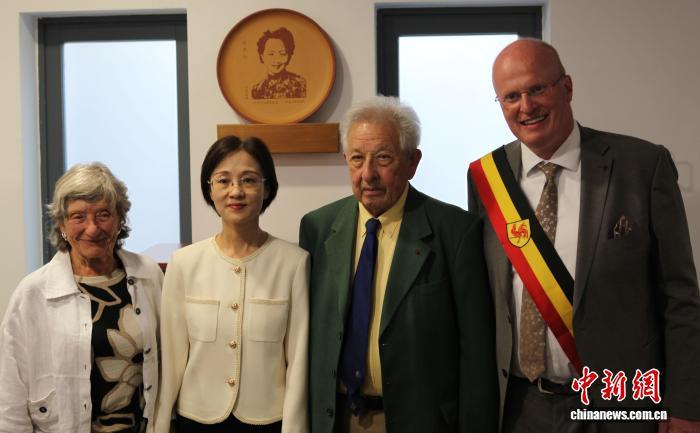 當?shù)貢r間8月29日,中國駐比利時使館與比利時艾克興市政府共同舉辦活動,紀念當年從德國納粹手中救下艾克興市民的比利時“國家英雄”錢秀玲。圖為中國駐比利時使館臨時代辦李艷(左二)、艾克興市市長塞巴斯蒂安·德尚(右一)和錢秀玲家屬在錢秀玲頭像紫砂盤前合影留念。中新社記者 德永健 攝