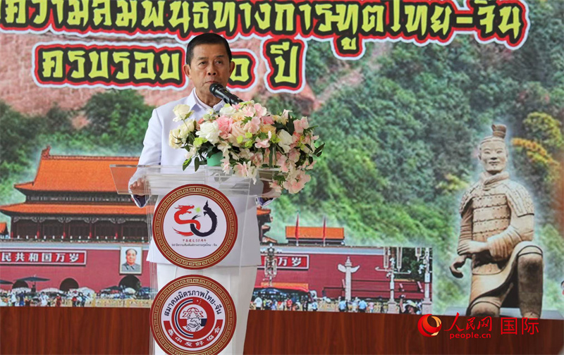 泰國(guó)前副總理兼泰中友好協(xié)會(huì)會(huì)長(zhǎng)功·塔帕朗西致辭。人民網(wǎng)記者 簡(jiǎn)承淵攝