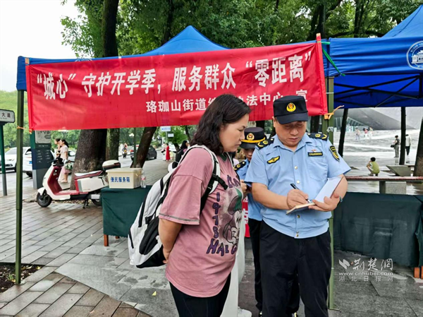 在校內(nèi)外的兩處宣傳服務(wù)點,綜合執(zhí)法中心工作人員不僅發(fā)放法規(guī)宣傳資料,耐心講解市容管理、攤販經(jīng)營等規(guī)定,更主動為新生及家長提供指路、拍照、咨詢等暖心服務(wù)。許多新生家庭在宣傳點留下入學第一張合影,執(zhí)法人員熱情擔任“攝影師”,用鏡頭記錄初入珞珈的喜悅瞬間。一位韓國留學生因語言不通在宣傳點求助,執(zhí)法隊員立即手繪詳細地圖并標注路線,幫助其順利找到目的地。留學生用中文連聲道謝,并向隊員豎起大拇指。
