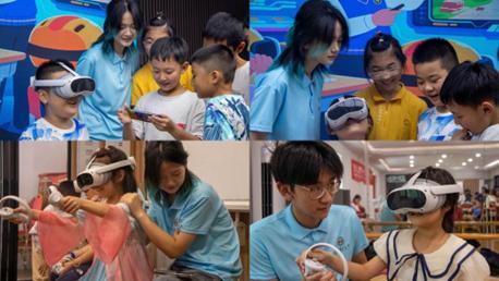 實踐隊引入VR技術(shù)開展體育活動,孩子們戴上VR眼鏡后,可在虛擬場景中體驗籃球、羽毛球等運動,電子軌跡與虛擬星空讓體育活動突破場地限制。隊員們在旁守護,確保孩子們在虛實結(jié)合的環(huán)境中安全奔跑、跳躍,額角的汗珠與興奮的呼喊,讓孩子們在趣味中感受運動的魅力,實現(xiàn)運動形式創(chuàng)新化、虛擬化、趣味化。