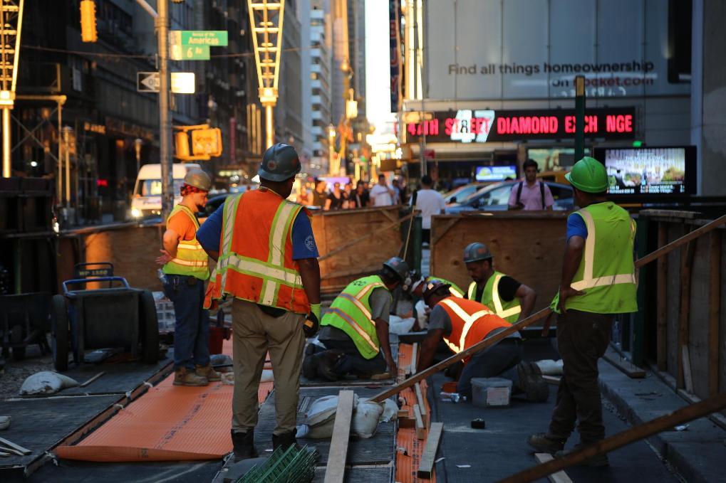 6月24日,建筑工人在美國紐約曼哈頓街頭工作。新華社記者劉亞南攝