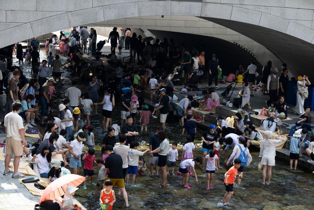 6月14日,人們?cè)陧n國(guó)首爾的清溪川戲水。新華社發(fā)(全休相攝)