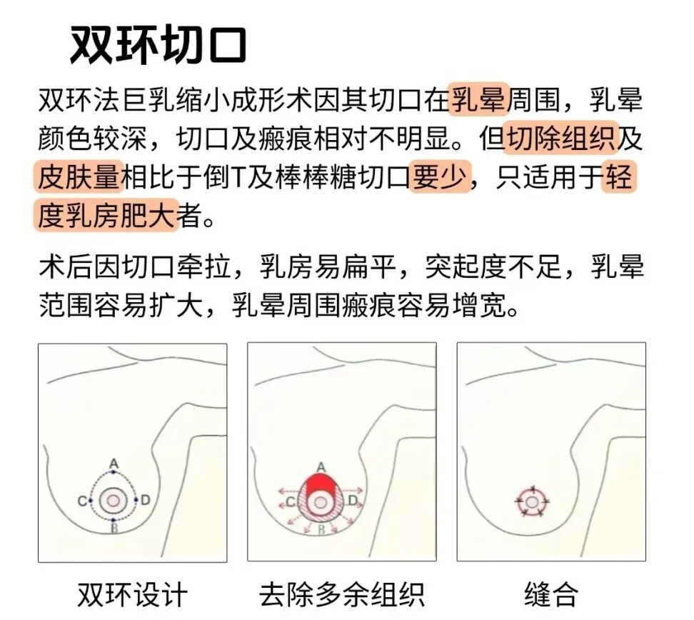 這是一種經(jīng)典的巨乳縮小術(shù)式。通過(guò)精心設(shè)計(jì),去除多余的組織、脂肪和皮膚,并將乳頭乳暈復(fù)合體移位至新高點(diǎn),最后縫合為一個(gè)圍繞乳暈的“棒棒糖”狀或垂直短瘢痕切口。