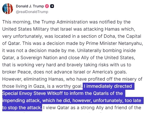 9日,美國(guó)總統(tǒng)特朗普在其社交平臺(tái)“真實(shí)社交”發(fā)文稱(chēng),當(dāng)天上午,政府接到美軍通知,以色列正在對(duì)位于多哈某區(qū)域的哈馬斯目標(biāo)實(shí)施襲擊。特朗普稱(chēng),襲擊是以總理內(nèi)塔尼亞胡單方面的決定,而不是他的決定。特朗普稱(chēng),他當(dāng)時(shí)“立即指示特使威特科夫向卡塔爾通報(bào)即將發(fā)生的襲擊”。襲擊發(fā)生后,他與卡塔爾埃米爾(國(guó)家元首)及首相通話(huà),保證此類(lèi)事件不會(huì)在其領(lǐng)土重演。他還已指示國(guó)務(wù)卿魯比奧盡快完成與卡塔爾的防務(wù)合作協(xié)議。