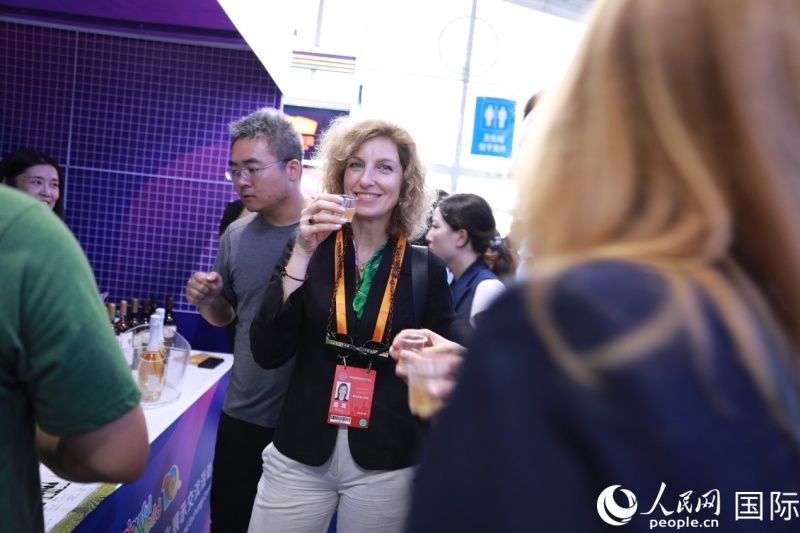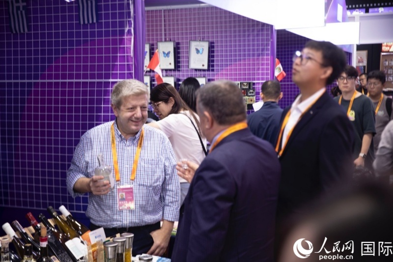 | 希臘共和國(guó)駐華大使館展區(qū)工作人員正在向游客介紹特色酒類產(chǎn)品。人民網(wǎng) 李澤攝 |