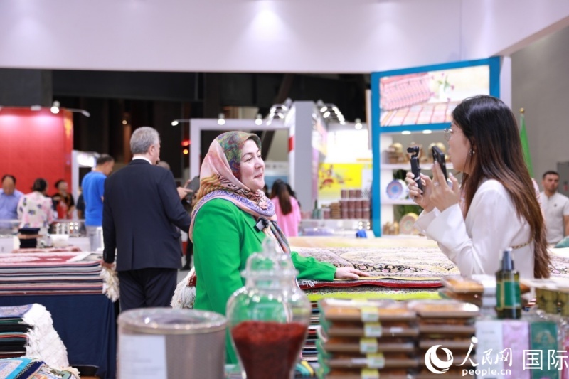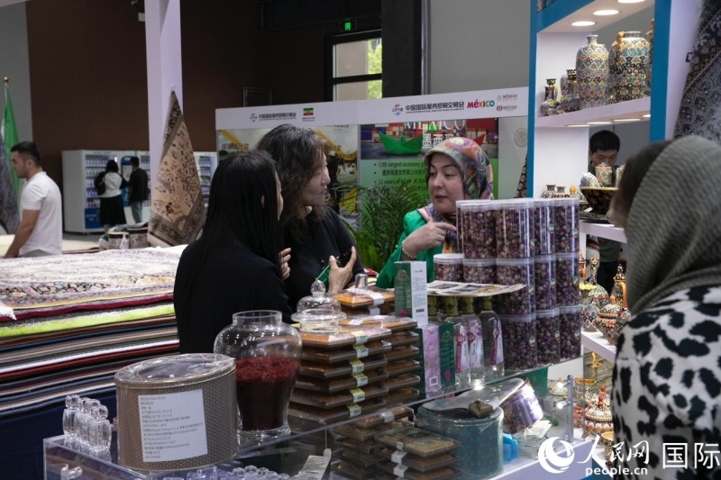 | 伊朗伊斯蘭共和國(guó)展區(qū)工作人員正在接受采訪,介紹產(chǎn)品。人民網(wǎng)記者 賈文婷攝 |