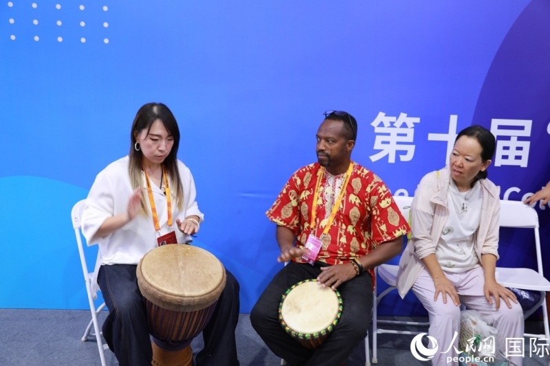 | 馬里共和國(guó)駐華大使館展區(qū)工作人員正在教游客表演非洲鼓。人民網(wǎng)記者 賈文婷攝 |