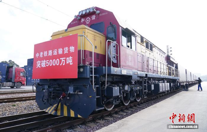 2025年1月2日,一列滿載新鮮果蔬的中老鐵路國際貨物列車從中國云南昆明啟程駛向老撾,標志著自2021年12月3日全線開通運營以來,中老鐵路貨物運輸總量突破5000萬噸?!≈行律缬浾?劉冉陽 攝
