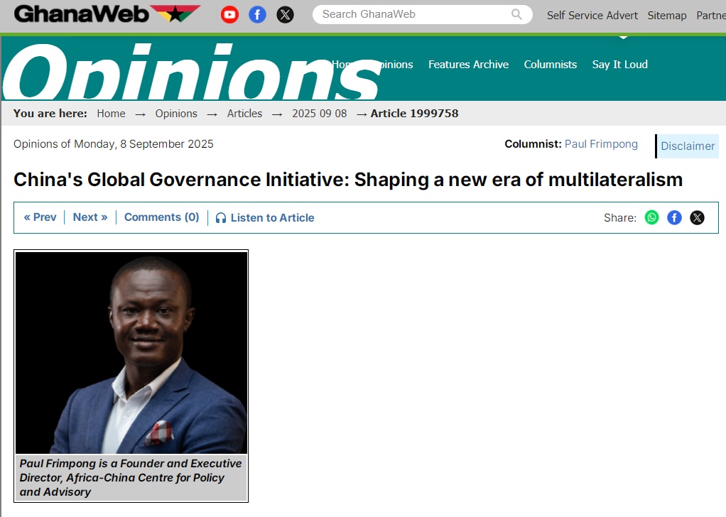 中國日報(bào)網(wǎng)9月12日電 加納新聞網(wǎng)站“Ghana Web”9月8日刊發(fā)加納非中政策咨詢中心執(zhí)行主任保羅·弗林蓬的署名文章《中國全球治理倡議:塑造多邊主義新時(shí)代》,對中國提出的全球治理倡議予以高度評價(jià)。