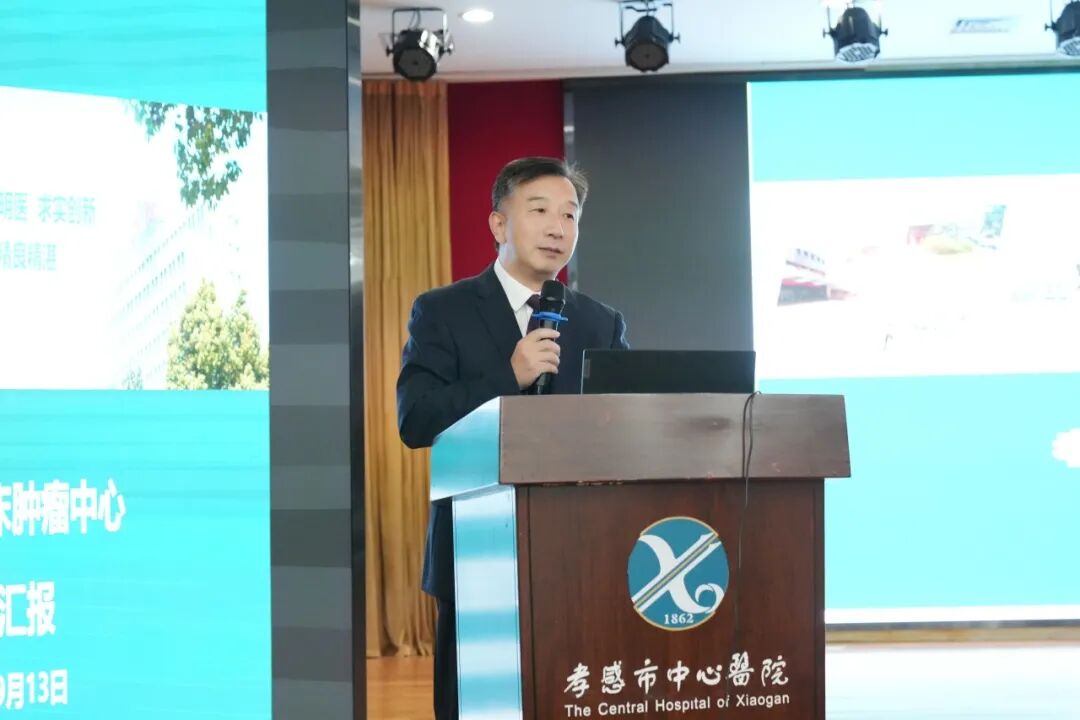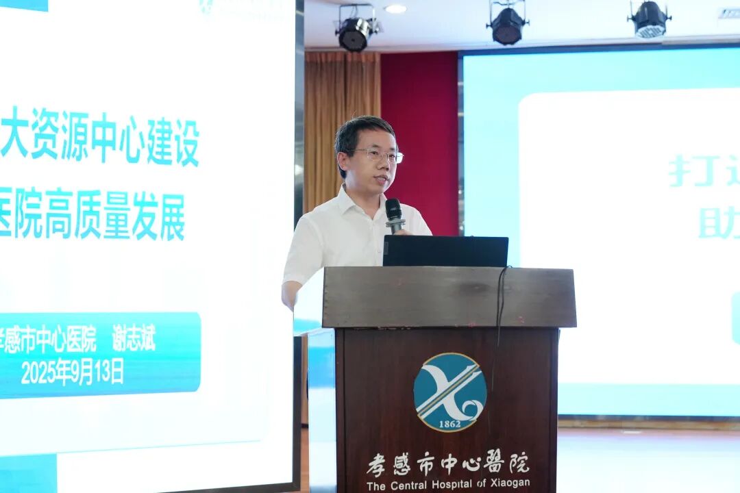 報(bào)告環(huán)節(jié)由市中心醫(yī)院副院長(zhǎng)胡超華主持,聚焦政策解讀與實(shí)踐分享。市醫(yī)療保障局黨組成員、副局長(zhǎng)魏其義,市衛(wèi)生健康委黨組成員、副主任胡偉清,市中心醫(yī)院院長(zhǎng)謝志斌分別就孝感市落實(shí)三明醫(yī)改相關(guān)醫(yī)保政策、孝感市深化分級(jí)診療的生動(dòng)實(shí)踐和孝感市中心醫(yī)院五大資源中心創(chuàng)建等內(nèi)容進(jìn)行了介紹。孝感市分子診斷中心、孝感市腫瘤臨床中心、孝感市公共衛(wèi)生臨床中心、孝感市數(shù)智化病理診斷中心的相關(guān)負(fù)責(zé)人依次在會(huì)上就各中心建設(shè)情況進(jìn)行了匯報(bào)。