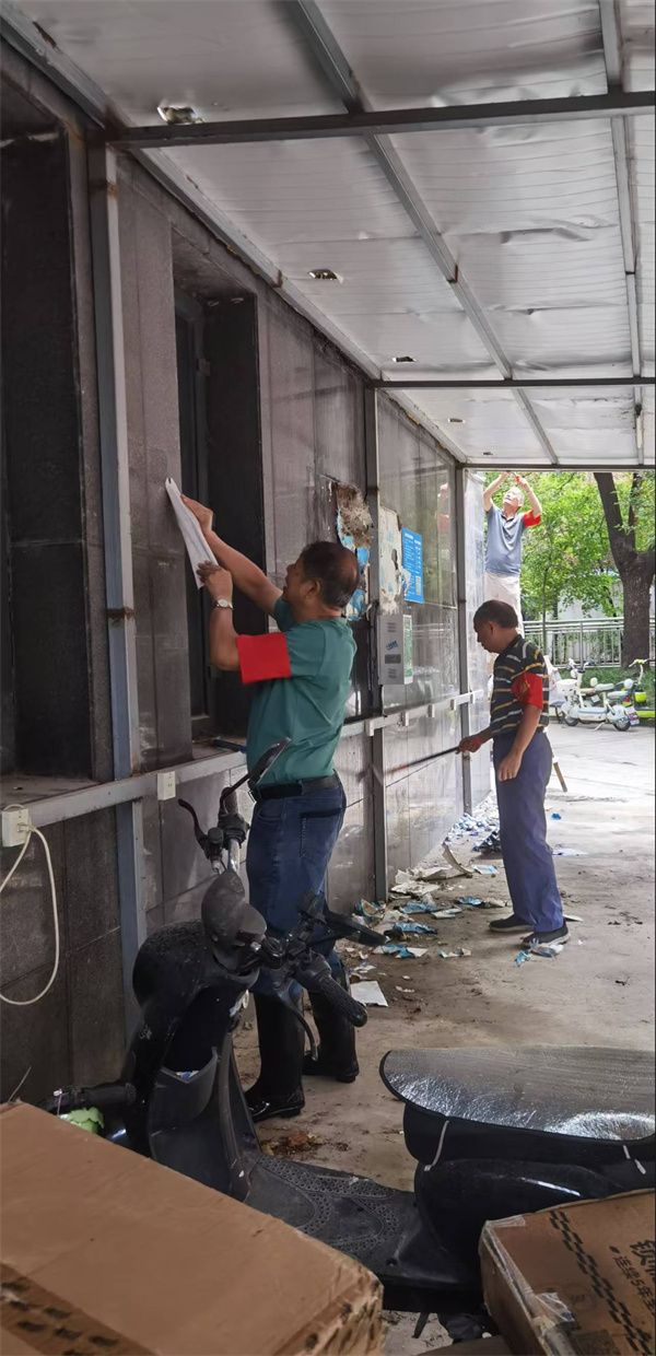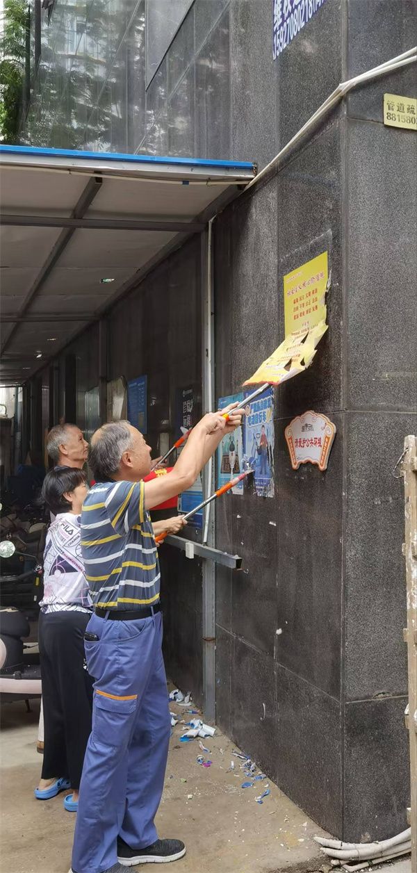 行動(dòng)中,志愿者們分為兩組,分工協(xié)作、高效推進(jìn)。“牛皮癬”清理組攜帶專業(yè)工具,對(duì)小區(qū)各樓棟墻面、單元門、電梯間及公共設(shè)施上的各類小廣告進(jìn)行徹底清理。面對(duì)黏附牢固的廣告貼紙,大家先以噴壺濕潤軟化,再細(xì)致鏟除,最后用抹布擦拭干凈,不遺漏任何一處衛(wèi)生死角。