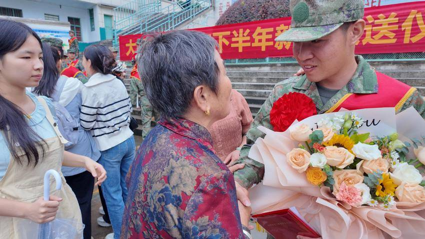 儀式在莊嚴(yán)的中華人民共和國(guó)國(guó)歌中拉開帷幕,禮山學(xué)校的學(xué)生代表向新兵送上鮮花,致敬最可愛的人,也為孩子們上了一堂最生動(dòng)的國(guó)防教育課。工作人員為每位新兵贈(zèng)送紅色書籍《大悟紅色記憶》,希望新兵在軍營(yíng)中傳承大別山革命精神,賡續(xù)紅色血脈。隨后,全體新兵與家人們合影留念,一張張青春的臉龐、一個(gè)個(gè)堅(jiān)定的眼神,定格成此刻最動(dòng)人的畫面。