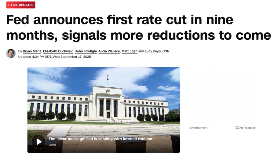從2024年9月18日降息50個(gè)基點(diǎn)的大幅急轉(zhuǎn),到2025年9月17日降息25個(gè)基點(diǎn)的謹(jǐn)慎試探,這不僅反映出經(jīng)濟(jì)形勢(shì)的演變,也折射出美聯(lián)儲(chǔ)在政治與市場(chǎng)夾縫中的平衡術(shù)。前一次是對(duì)經(jīng)濟(jì)硬著陸風(fēng)險(xiǎn)的緊急回避,這一次則是在就業(yè)壓力與政治干預(yù)陰影下的小心調(diào)整。對(duì)市場(chǎng)與全球而言,這不僅是一次關(guān)于利率的技術(shù)決策,更是一場(chǎng)關(guān)于央行獨(dú)立性與政策可信度的深層博弈。(央視記者 武衛(wèi)紅)