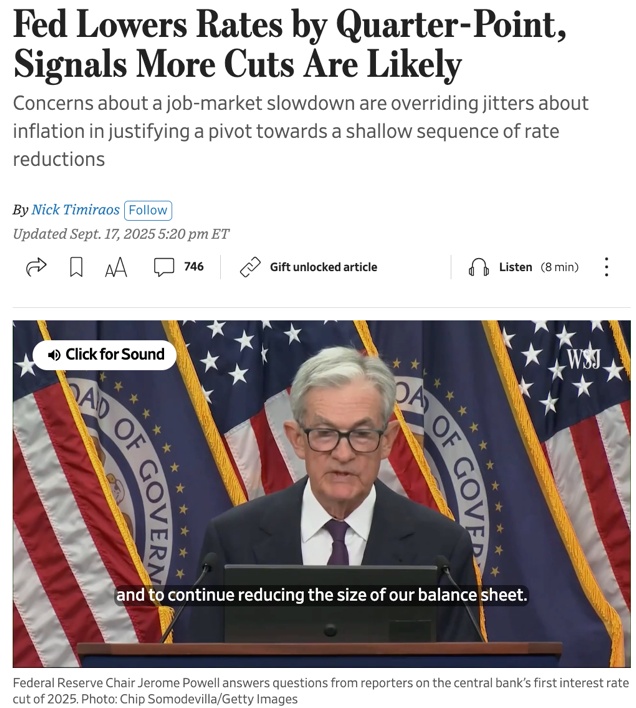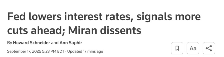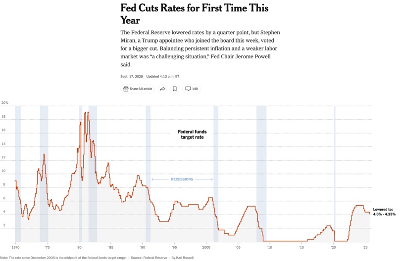 當(dāng)?shù)貢r(shí)間9月17日,如輿論預(yù)測(cè),美聯(lián)儲(chǔ)宣布下調(diào)聯(lián)邦基準(zhǔn)利率25個(gè)基點(diǎn)至4.00%~4.25%的區(qū)間。這不僅是2024年底以來(lái)的首次降息,也是在就業(yè)市場(chǎng)走弱、政治壓力高企、全球市場(chǎng)高度關(guān)注下的一次“聚光燈會(huì)議”。從聲明到點(diǎn)陣圖,再到主席鮑威爾的記者會(huì),釋放出的信號(hào)既有政策方向,也試圖表達(dá)美聯(lián)儲(chǔ)捍衛(wèi)其獨(dú)立性的立場(chǎng)。