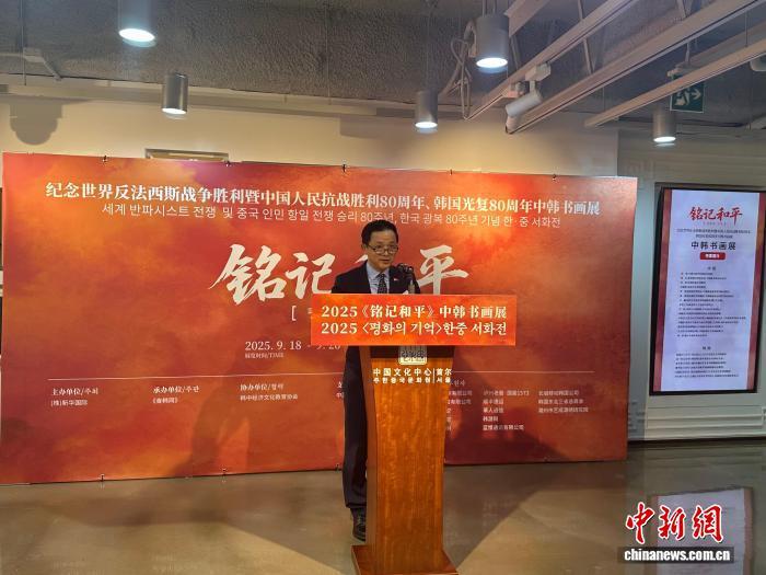 9月18日,《銘記和平——紀(jì)念世界反法西斯戰(zhàn)爭(zhēng)暨中國(guó)人民抗戰(zhàn)勝利80周年、韓國(guó)光復(fù)80周年中韓書畫展》在首爾中國(guó)文化中心開幕。圖為中國(guó)駐韓國(guó)大使戴兵致辭。姜春雨 攝