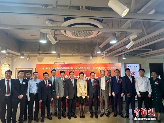 9月18日,《銘記和平——紀(jì)念世界反法西斯戰(zhàn)爭(zhēng)暨中國(guó)人民抗戰(zhàn)勝利80周年、韓國(guó)光復(fù)80周年中韓書畫展》在首爾中國(guó)文化中心開幕。圖為活動(dòng)合影。姜春雨 攝