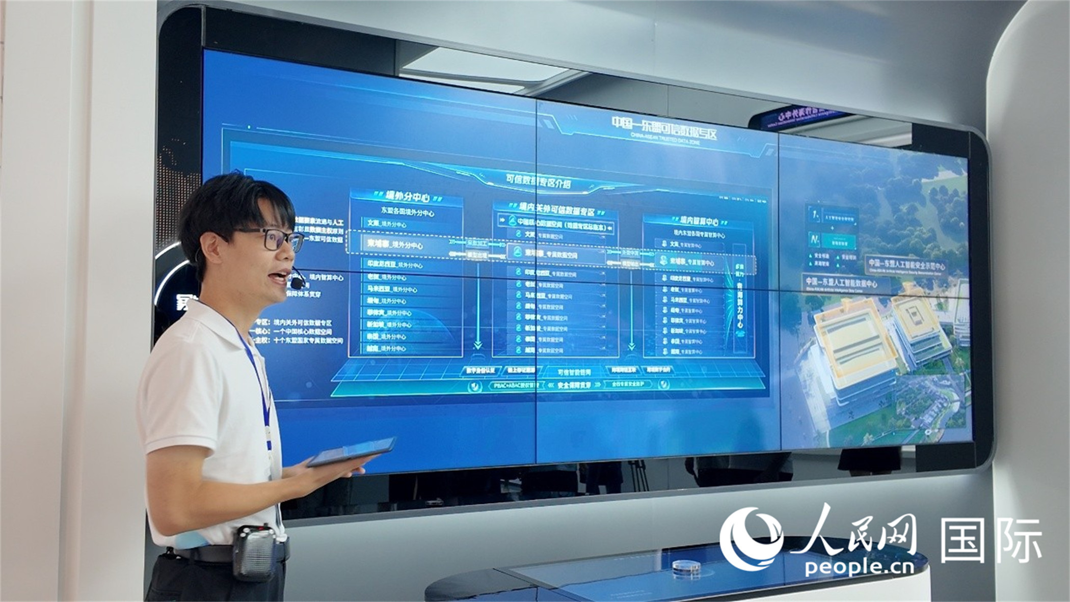 講解員正在為參觀嘉賓講解中心重點展示項目——中國—東盟可信數(shù)據(jù)專區(qū)。人民網(wǎng) 張醴泉攝