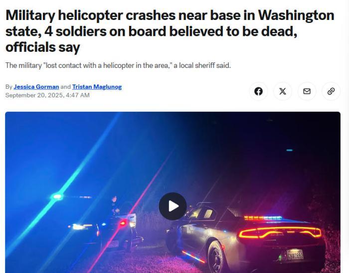 中新網(wǎng)9月20日電 綜合外媒報(bào)道,美國(guó)陸軍特種作戰(zhàn)司令部當(dāng)?shù)貢r(shí)間9月19日確認(rèn),一架MH-60“黑鷹”直升機(jī)日前在華盛頓州劉易斯-麥科德聯(lián)合基地附近墜毀,事故或造成4名士兵遇難。