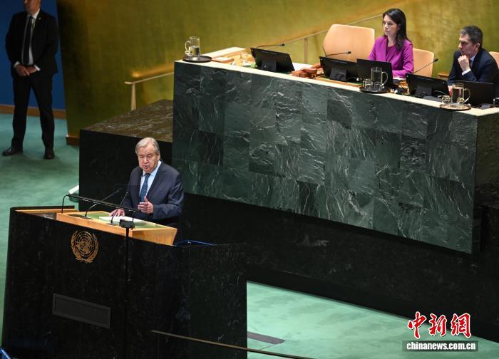 當(dāng)?shù)貢r(shí)間9月23日,紐約聯(lián)合國(guó)總部,第80屆聯(lián)合國(guó)大會(huì)一般性辯論開(kāi)幕。圖為聯(lián)合國(guó)秘書(shū)長(zhǎng)古特雷斯在開(kāi)幕式上致辭?!≈行律缬浾?陳孟統(tǒng) 攝