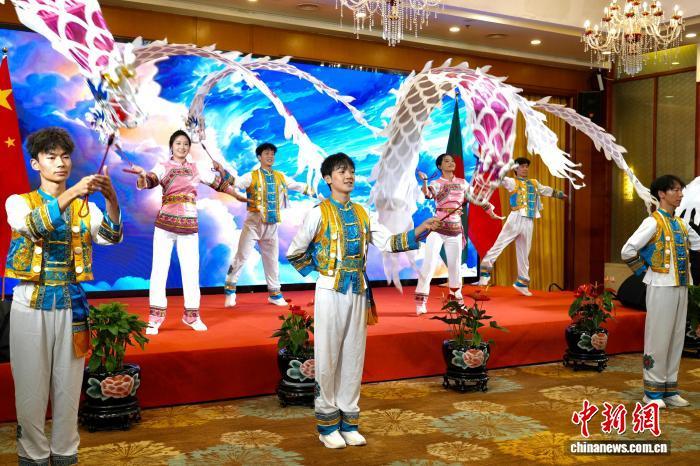 9月26日,慶祝中華人民共和國與孟加拉人民共和國建交50周年招待會現(xiàn)場演出的白族舞蹈《白族彩帶龍》?!×_婕 攝