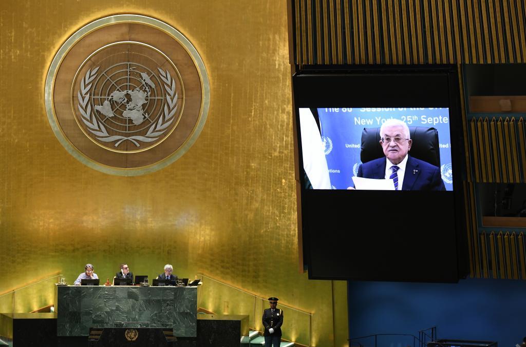 9月25日,在位于紐約的聯(lián)合國(guó)總部,巴勒斯坦總統(tǒng)阿巴斯以視頻連線方式在聯(lián)合國(guó)大會(huì)一般性辯論上發(fā)言。新華社記者李睿攝