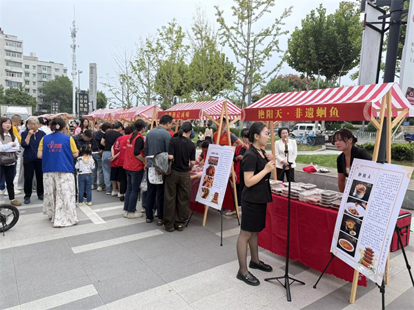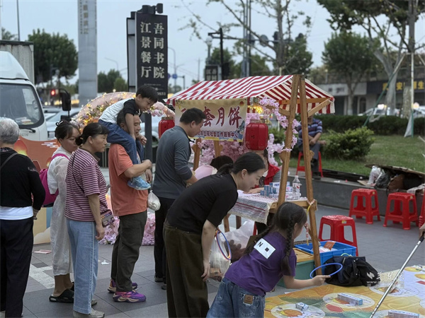 活動(dòng)現(xiàn)場(chǎng)設(shè)置市集區(qū)與演藝區(qū)兩大板塊。市集區(qū)內(nèi)人頭攢動(dòng),轄區(qū)共建單位、音樂(lè)企業(yè)與多家商戶(hù)積極參與,匯聚特色商品與音樂(lè)互動(dòng)體驗(yàn)。大音琴行展出多種樂(lè)器并銷(xiāo)售音樂(lè)周邊產(chǎn)品,吸引眾多武漢音樂(lè)學(xué)院學(xué)生及音樂(lè)愛(ài)好者駐足交流;元祖食品推出月餅、點(diǎn)心等節(jié)令糕點(diǎn)展銷(xiāo),為中秋佳節(jié)提前預(yù)熱;艷陽(yáng)天·非遺鮰魚(yú)(黃鶴樓店)、中百倉(cāng)儲(chǔ)、九州上醫(yī)館及多家大成路特色美食商戶(hù)也紛紛設(shè)點(diǎn),讓市民在觀賞演出之余,盡享購(gòu)物與美食樂(lè)趣。